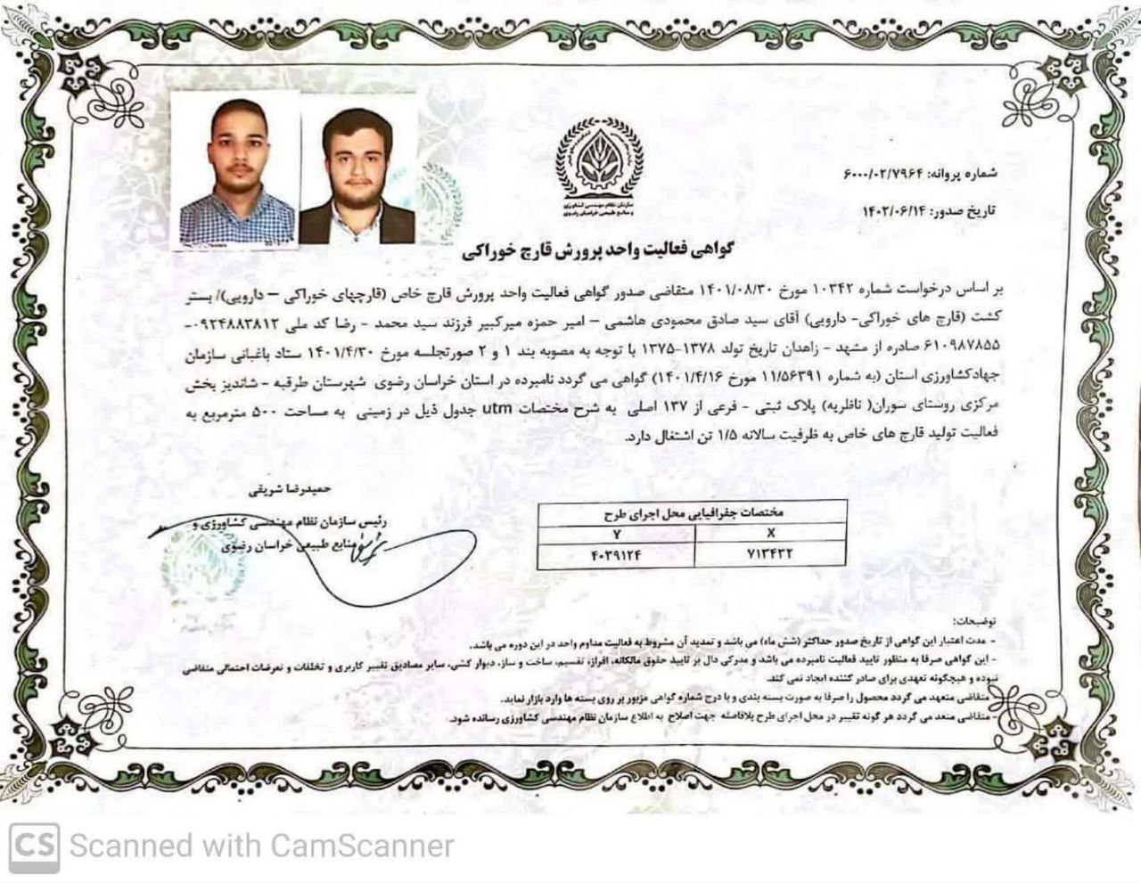 پروانه فعالیت واحد پرورش قارچ : با دریافت این پروانه، واحد تولیدی ما به طور رسمی افتتاح شد و مجوز لازم برای پرورش و تولید قارچهای خوراکی را کسب کردیم. این پروانه به ما اجازه میدهد تا محصولات خود را در بازار عرضه کنیم و به نیاز بازار داخلی و حتی خارجی پاسخ دهیم. همچنین، این مجوز نشان میدهد که ما تمامی استانداردهای بهداشتی و ایمنی را در تولید محصولات خود رعایت میکنیم.